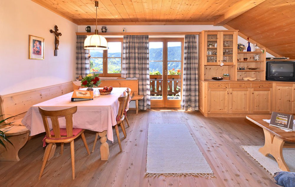 L’alloggio dispone di una cucina ben attrezzata con un’accogliente seduta ad angolo, un ampio soggiorno con TV e un invitante divano ad angolo per il vostro relax. Per un sonno riposante avrete a disposizione un’accogliente camera matrimoniale e un’ampia camera doppia. Iniziate la vostra giornata con una meravigliosa vista panoramica sulle montagne dello Sciliar, del Latemar e del Catinaccio…direttamente dal balcone del vostro appartamento. Il bagno è dotato di vasca da bagno, doccia, lavandino e WC. Inoltre offriamo il servizio di lavanderia con un piccolo contributo alle spese. In ogni appartamento è a disposizione uno stendibiancheria privato; inoltre, presso il maso si trova un grande stenditoio accessibile liberamente. Su richiesta è possibile prendere in prestito anche un ferro da stiro. Asciugamani e biancheria da letto sono messi a disposizione dai padroni di casa.